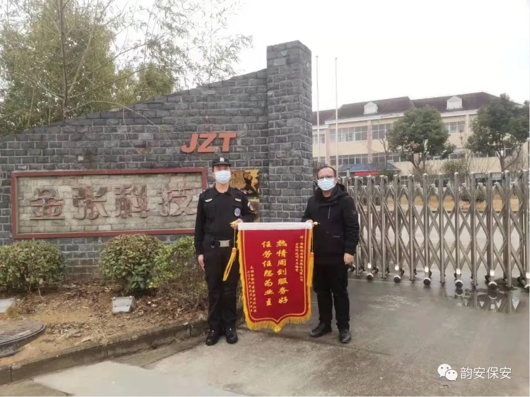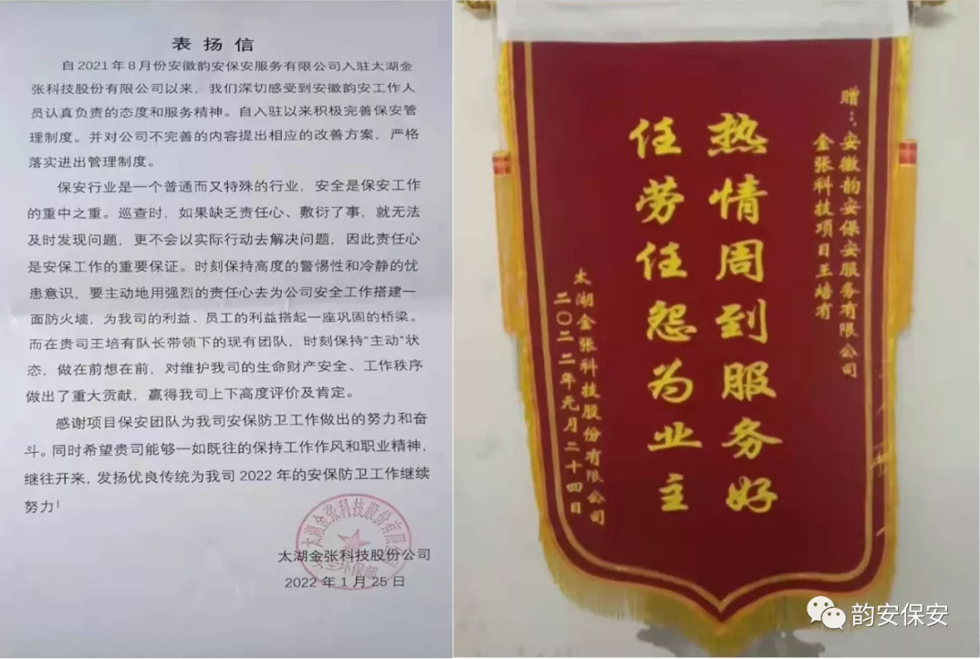 安徽韻安保安服務(wù)有限公司自承接太湖金張科技股份有限公司安保項(xiàng)目以來(lái),公司領(lǐng)導(dǎo)高度重視,深入現(xiàn)場(chǎng),組織人力,認(rèn)真負(fù)責(zé)做好各項(xiàng)安保服務(wù)工作,及時(shí)有效地完成各項(xiàng)任務(wù)。為此,時(shí)值小年,客戶先后送來(lái)表?yè)P(yáng)信與錦旗,對(duì)韻安公司做好安保服務(wù)項(xiàng)目各項(xiàng)工作給予高度肯定與贊揚(yáng)。